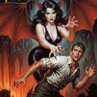A dark, dramatic scene featuring a seductive demoness with bat wings reaching out to a terrified man. The fiery background enhances the atmosphere of danger and temptation.