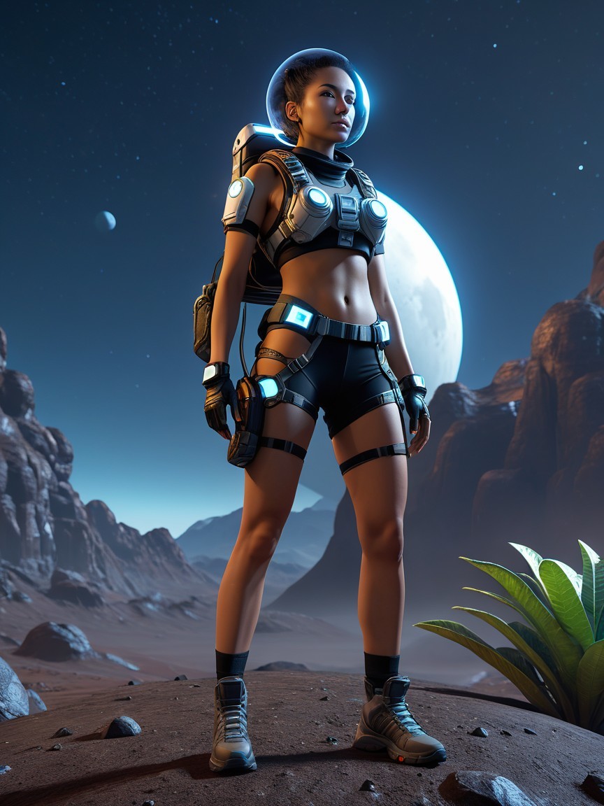A young woman with striking blue hair and a geometric design on her face and body holds a golden pen, set against a dark background that accentuates her futuristic appearance.
