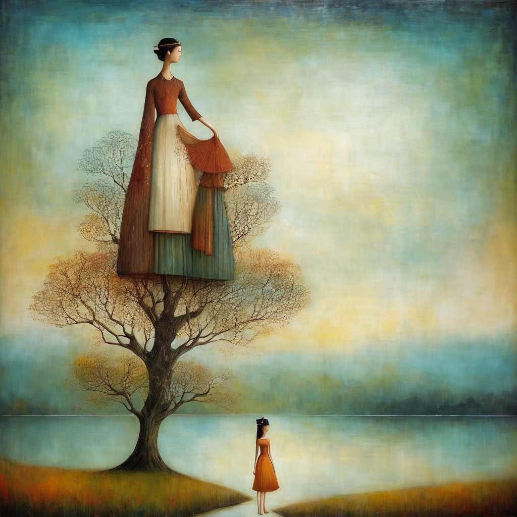 A woman in a dress stands by a tree with houses on its branches, facing a child across a serene water body, amidst a tranquil landscape.