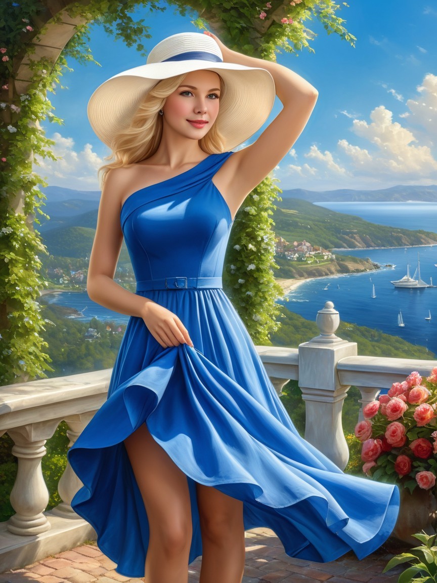 A woman in a stylish blue dress and wide-brimmed hat poses gracefully against a scenic backdrop of mountains and water, surrounded by lush greenery and vibrant flowers.