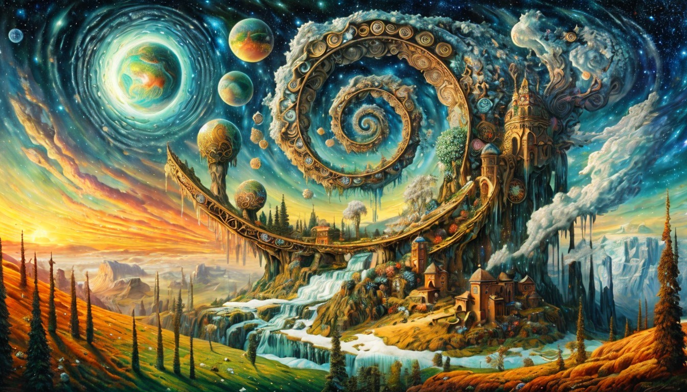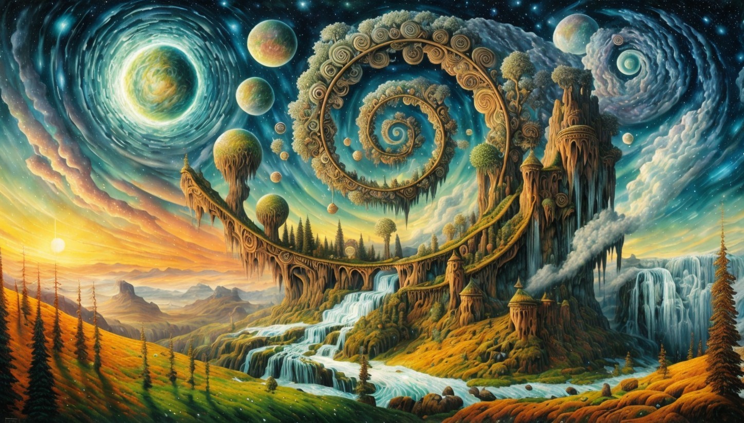 + Prompt:landscape under cosmic sky, waterfalls, ice, giant tree, SURREALIST EYE-ORB DETAILS, flowers by Tomasz Alen Kopera, Dariusz Zawadzki, Gustav Klimt and Picasso.