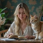 A serene scene of a woman with long, wavy hair sitting at a rustic table, reading a book. A fluffy orange cat sits beside her, surrounded by plants and warm sunlight filtering through the window.
