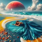 A woman in a vibrant, flowing dress stands near a large, reflective sphere on a colorful beach. Waves crash gently around her, creating a surreal and artistic atmosphere.