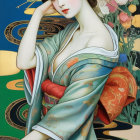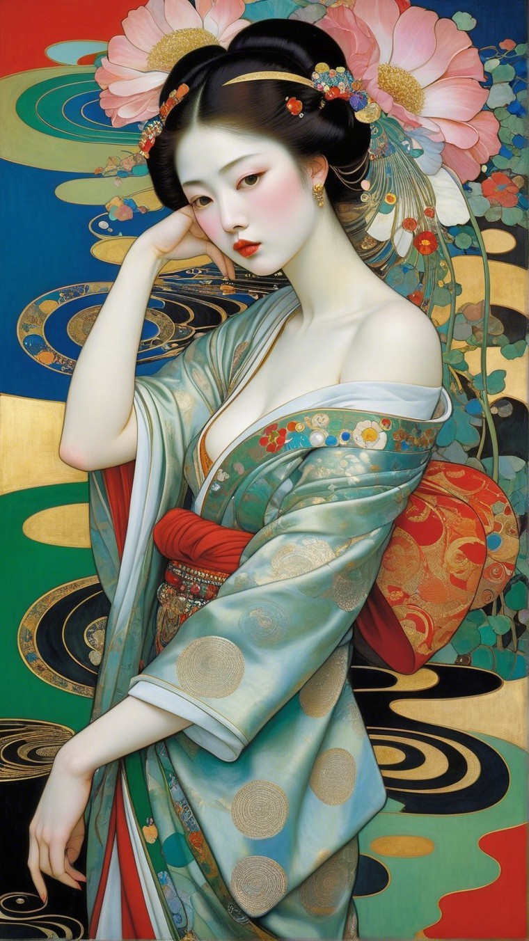 A beautiful woman in a traditional kimono, adorned with intricate patterns and flowers. Her graceful pose and serene expression evoke a sense of elegance and cultural artistry against a vibrant background.