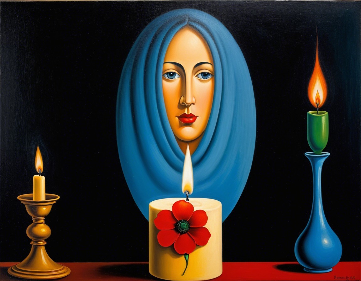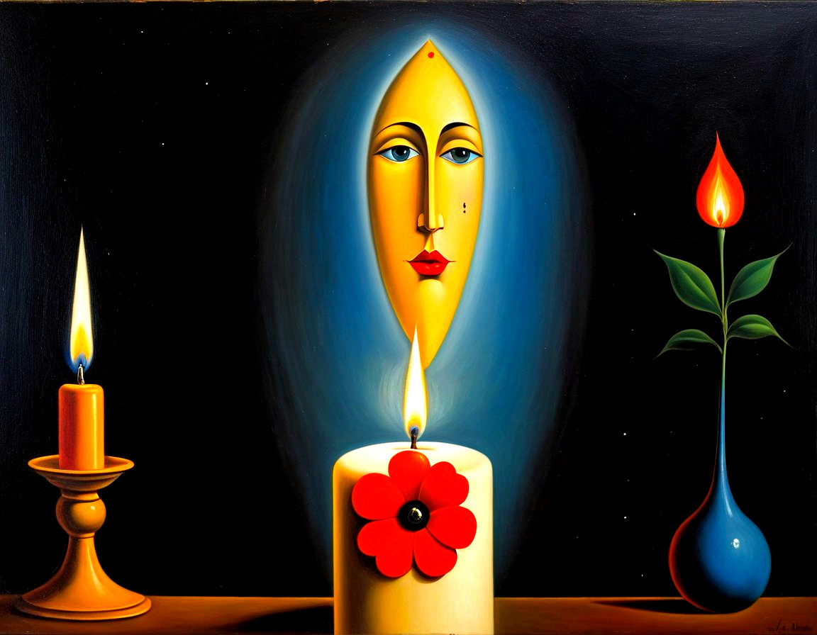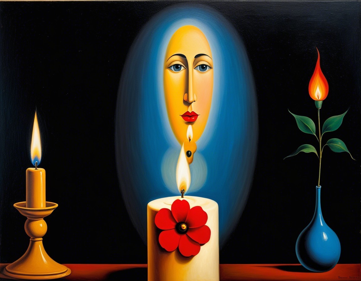 A striking portrait features a blue-skinned woman with curly hair, displaying flames above her face and candles beside her. A sun-like face is nestled below, creating a surreal, mystical scene.