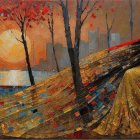 A vibrant sunset casts warm hues over a tranquil landscape. Colorful houses dot the rolling hills, surrounded by blooming flowers, creating a serene and inviting countryside scene.