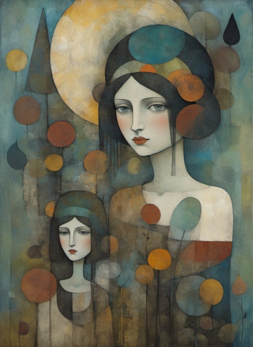 A painting of a stylized woman with a wide-brimmed hat, featuring muted earth tones and geometric background.