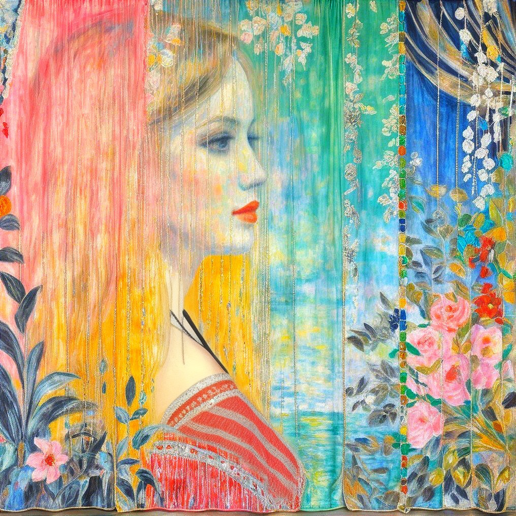 A serene portrait of a woman with long blonde hair, adorned in a red garment. She gazes thoughtfully, surrounded by vibrant flowers and a tranquil, colorful backdrop of water.