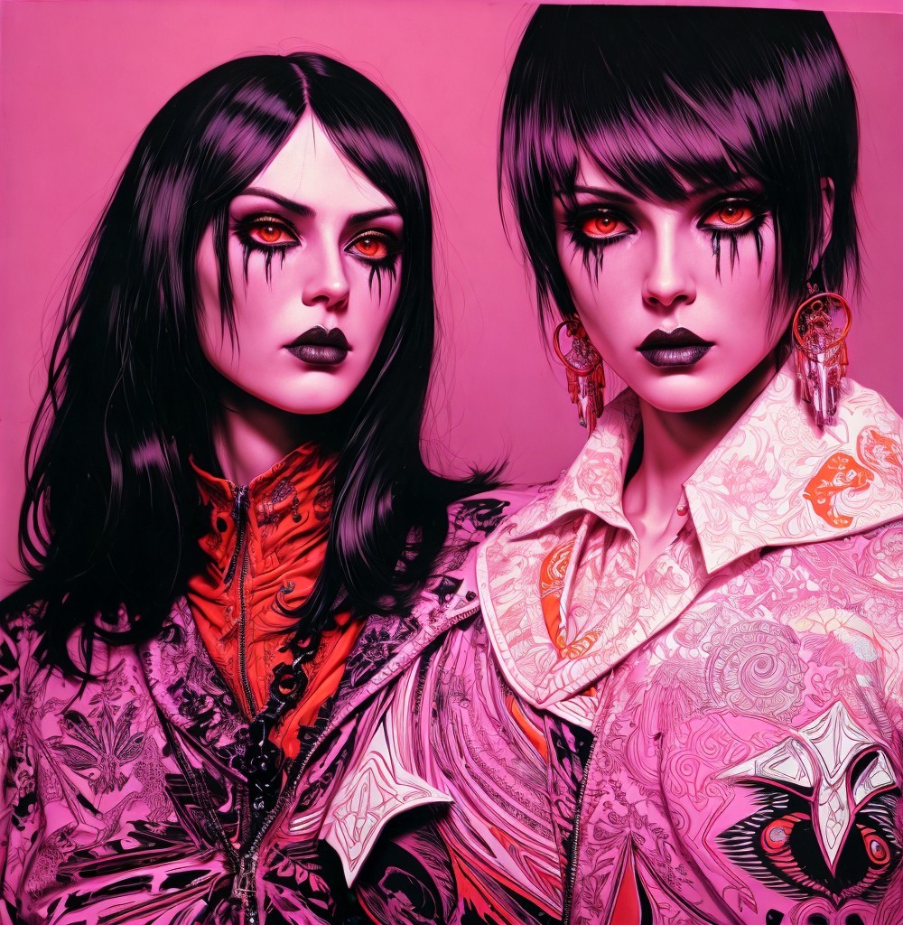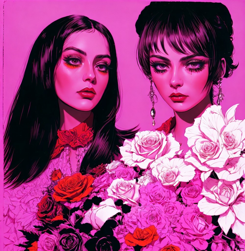 Prompt: + linoleum cut illustration, dark horrorpunk, glossy colors from above, dripping sparks, golden ratio, vibrant colors, art nouveau illustration