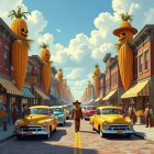 A vibrant street scene features whimsical giant corncob decorations with jack-o'-lantern faces. Classic cars line the road, and a scarecrow in a straw hat walks through the cheerful, sunny setting.