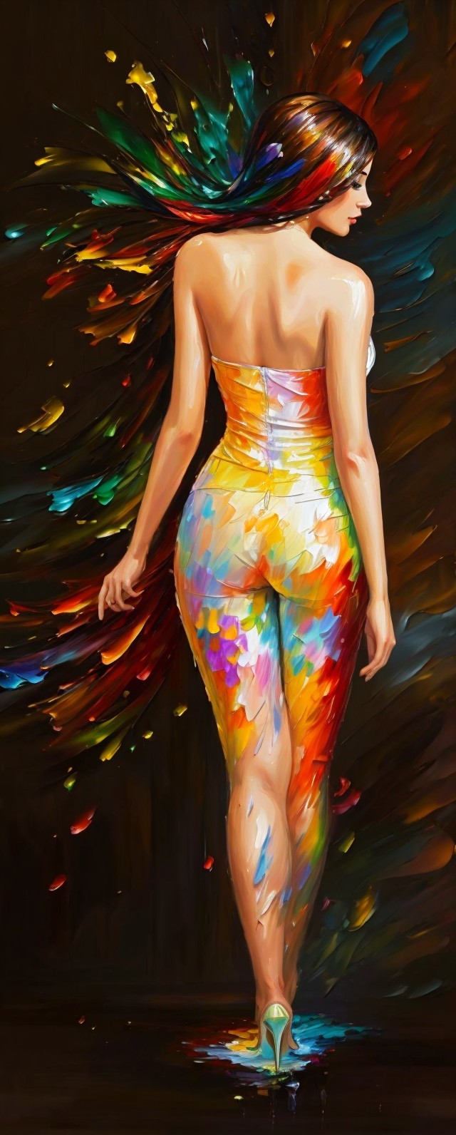 A colorful, expressive painting of a woman in a vibrant dress walking, with her hair fluttering, exuding dynamic and artistic flair.