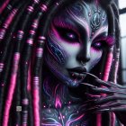 A mesmerizing close-up of a model with intricate face paint in vibrant pink and blue hues, featuring bold patterns. Her long, flowing hair and striking makeup create an enchanting, otherworldly effect.