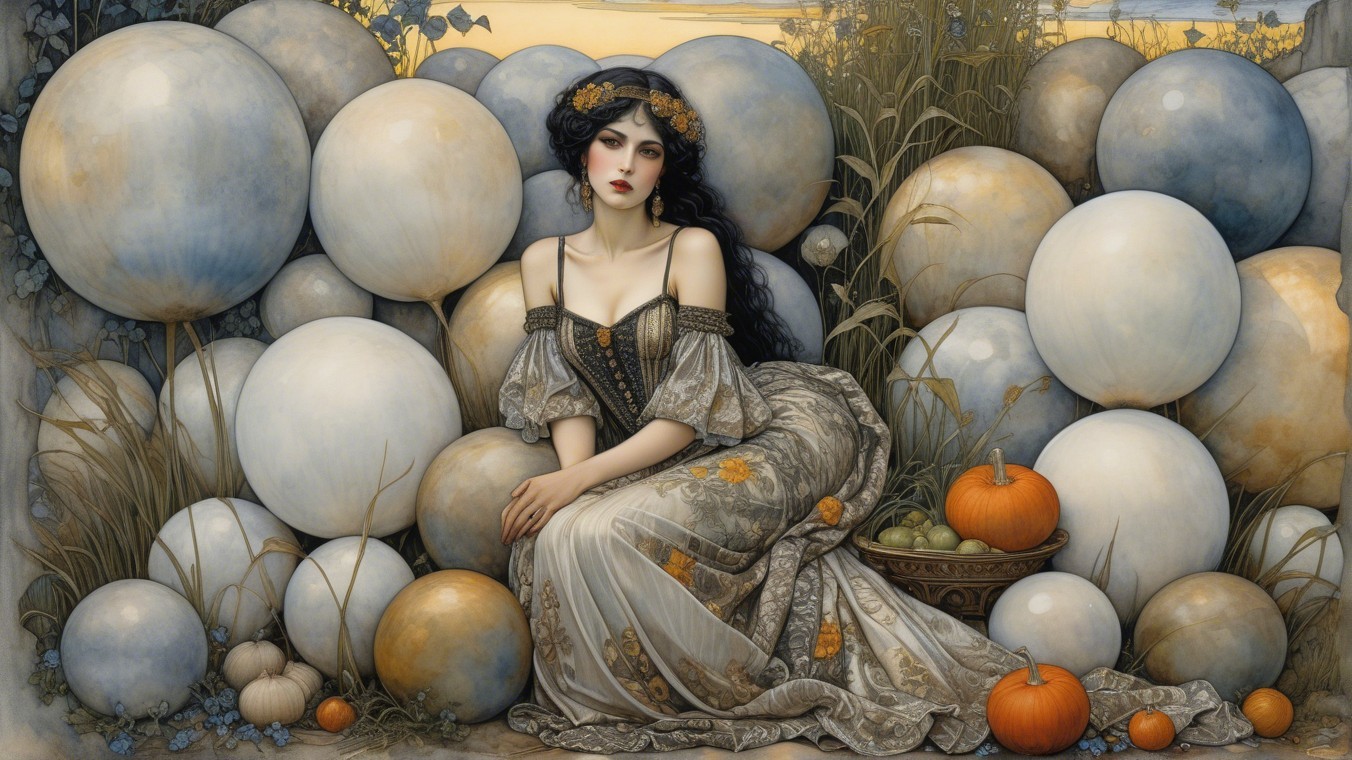 A serene woman in an elegant gown sits among large, decorative spheres. Her dark hair is adorned with flowers, and the muted colors create a dreamy, ethereal atmosphere, evoking a sense of tranquility.
