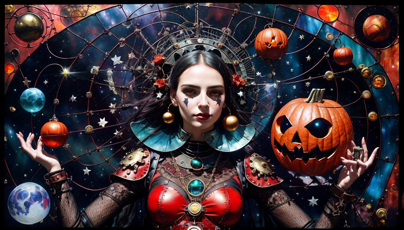 sensual portrait, natural beauty of cosmic witch, red metal pumpkin with face, gold, stars, orbs, red lace, steel leather, cybernetic clothes, wire mesh suits, interesting atmosphere