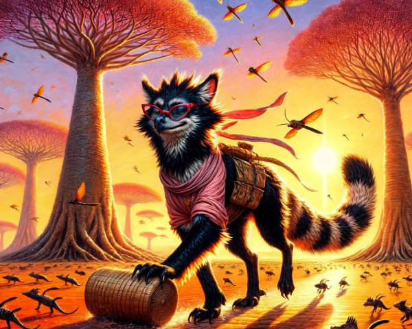 A whimsical scene featuring a red car with four passengers, set in a picturesque landscape with rolling hills, quaint houses, and curious animals like a fox and a cat.