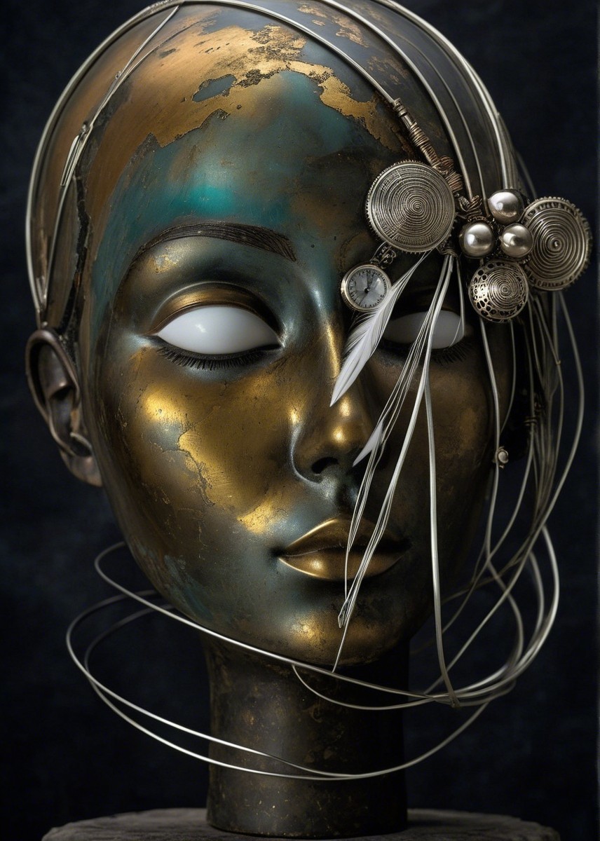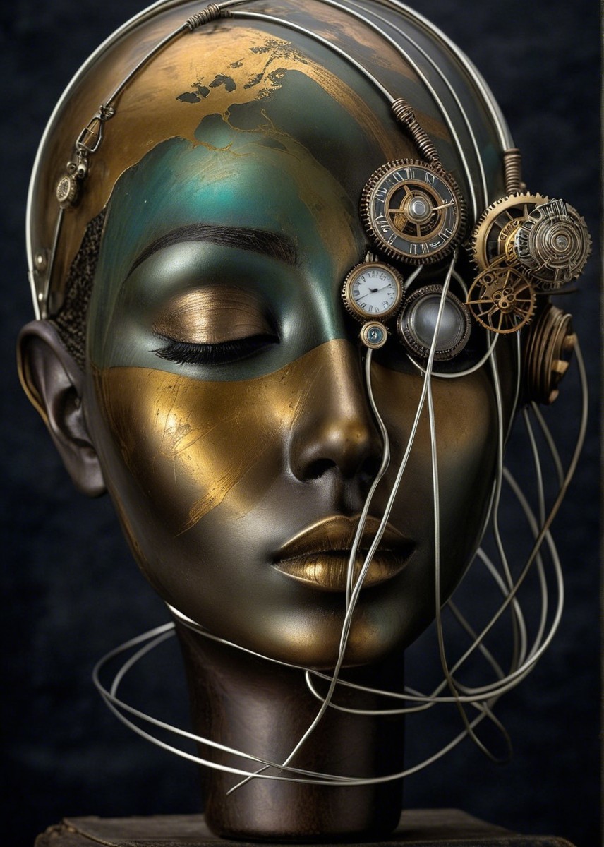 A futuristic bust featuring a bronze-hued face adorned with intricate steampunk elements, including gears, wires, and a vintage clock, creating a striking blend of technology and art.