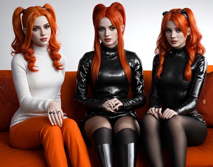 Three women with striking red hair in ponytails, wearing black and orange outfits, sitting on a red couch with a drink and a dessert.