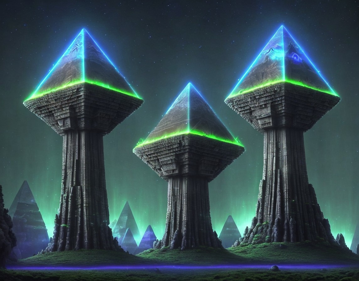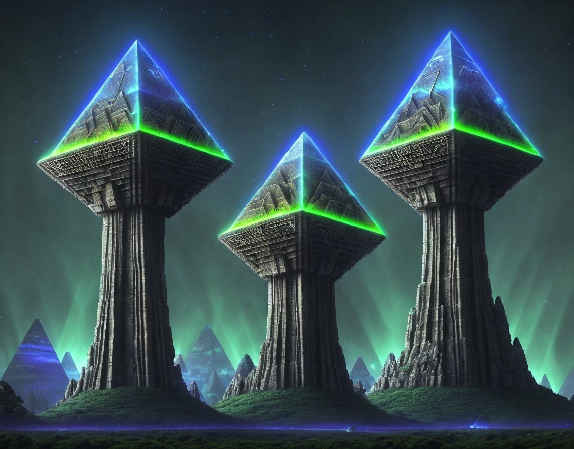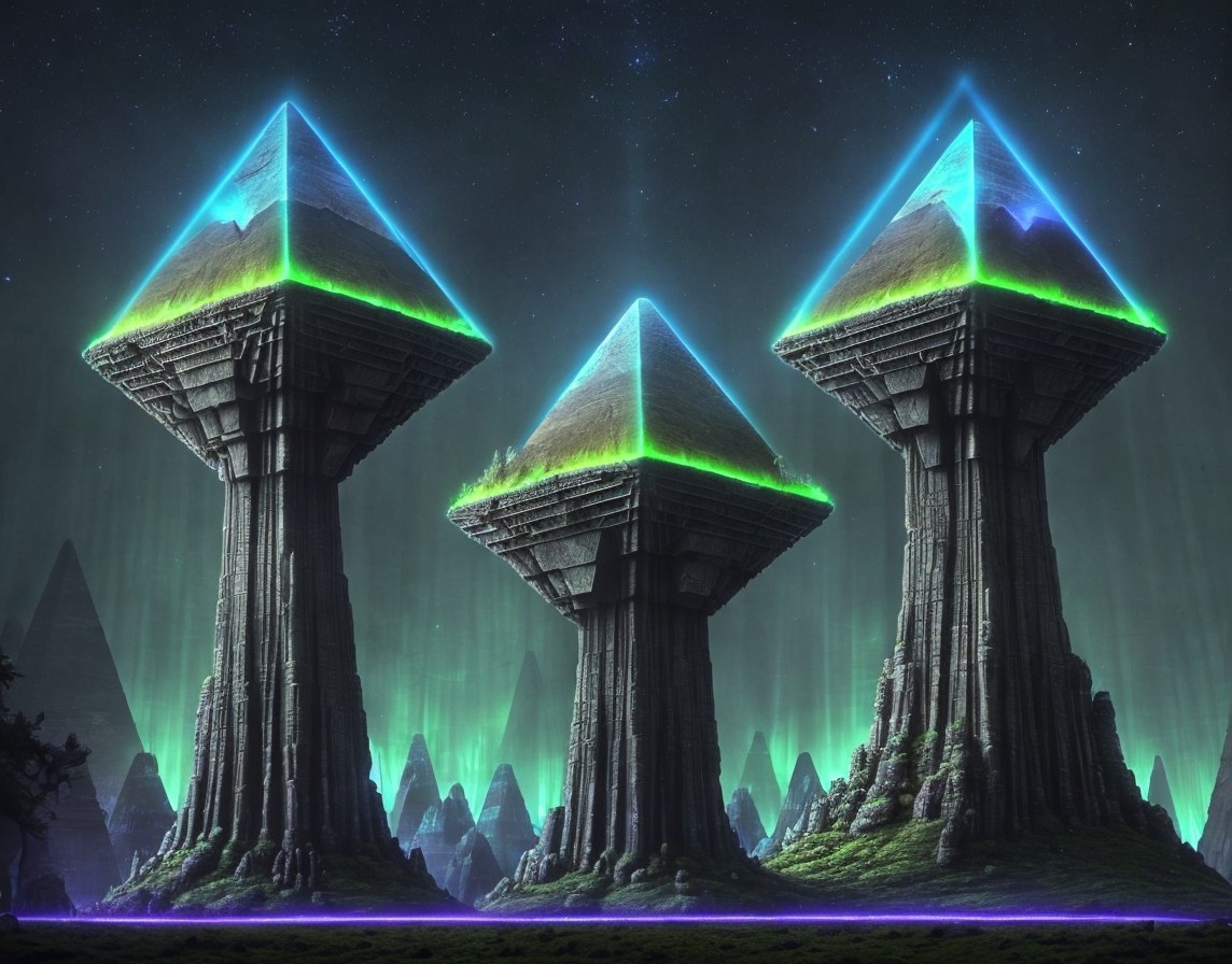 + Prompt:In the style of Cameron Gray, densely forested alien planet, pyramid with advanced technology in an eerie and mystical foggy forest landscape with an ethereal glow, with tall oak and willow trees, large boulders inscribed with runes and cliffs. Pyramid surrounded by bioluminescent mushrooms and colossal crystals. sacred geometry, mystical runes and alien glyphs. Surrealistic and supernatural elements under a cosmic sky. psychedelic sci-fi aesthetic, hallucinogenic art, visionary art, sci-fi LSD art