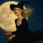 Prompt: Zdzslaw Beksinski painting, Carmen Dell' Orifice/Julie Harris/J.K. Rowling face age 75, Very mature beautiful smiling blonde Swedish fashion model as glamorous witch riding a broomstick by the moon, thin red lips, big gaunt cheekbones, lovely blue eyes, black eyeliner, long beautiful mature face, glamorous platinum blonde hair in swirled French twist, black pumps, midnight blue sky sprinkled with sparkling stars