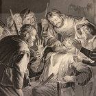 A central figure with a striking beard sits confidently in an ornate chair, surrounded by a diverse group of people. Their expressions convey curiosity, admiration, and intrigue in a vibrant, artistic setting.