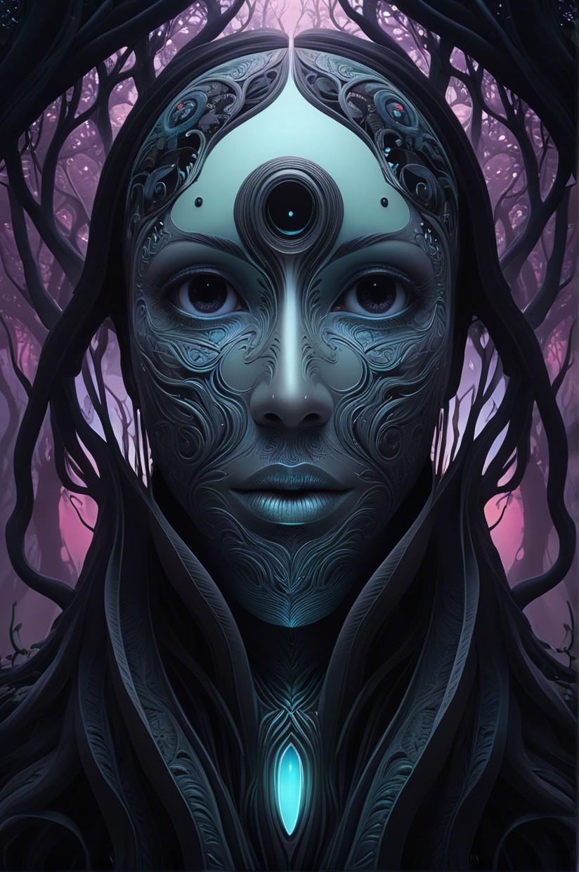 A vibrant, mystical forest filled with twisting trees adorned with colorful foliage. Lush flowers and plants flourish near a tranquil stream, creating an enchanting, dreamlike atmosphere.