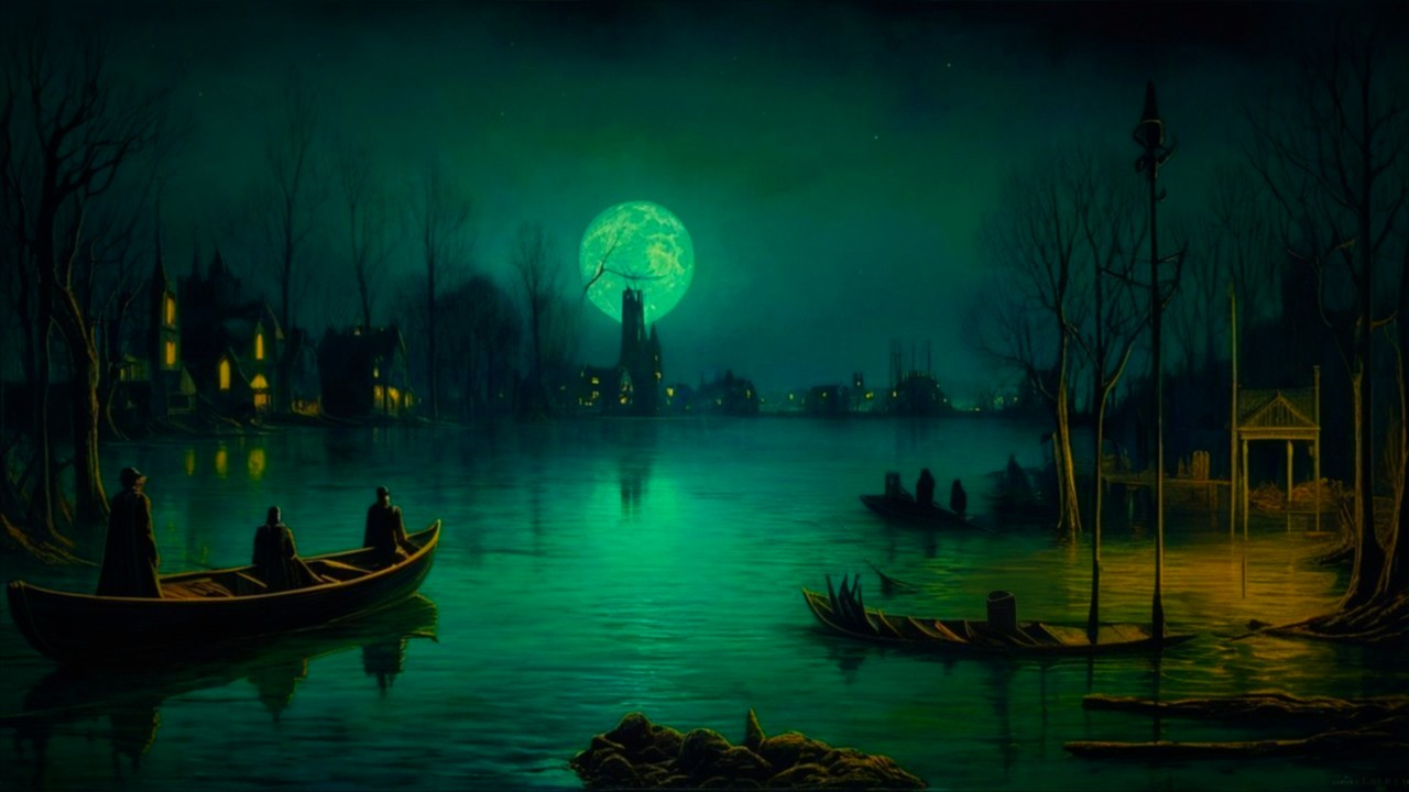 Prompt: "The drowning lake at midnight. A flooded town underwater.