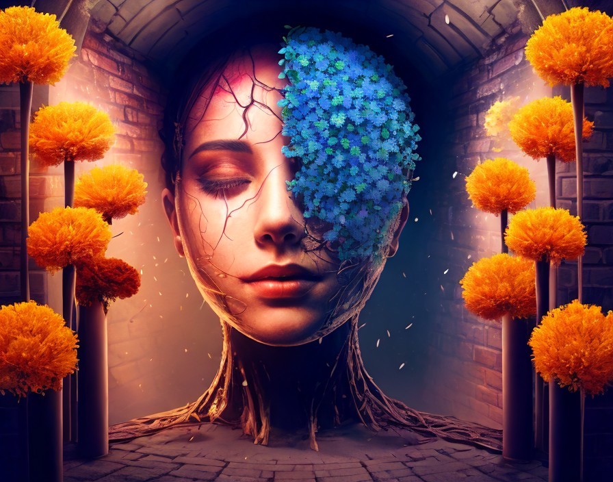 Prompt: "A soul escapes an open surgery wound and flowers upwards. Background is floating spores and mycellium in a brickwork basement of otherworldly pattern and construction."