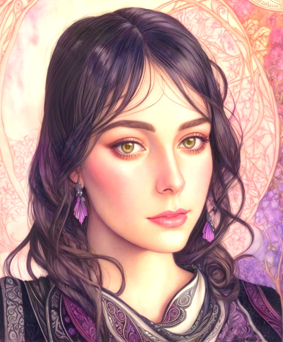 + Prompt:Fantasy portraiture,stylized pencil and charcoal sketch of a beautiful enchantress in patterned scarves and dresses in metallic inks. beautiful, poignant, quilling touching. soft watercolor coloring, style in Art Deco by Margaret Keane, Egon Schiele, Milo Manara, Arthur rackham, Catrin Welz-Stein, Grant Wood, Paul Klee, Overton Loyd, perfect eyes, perfect hands face , highly detailed, complementary colors, hyper detailed. Watercolor and ink splatter, dynamic pose, hues, tints of Edward Gorey , gold leaf color, silver leaf color, Geof Darrow inspired, emotional nature ephemeral sculptures of Andy Goldsworthy, radiance, essence captured as if created by William Turner, rendered in bright sepia colors, faded dark grey background, maximalism, geometrical lineage with intricate details hdr, anisotropic filtering 1.7, shadow mapping 1.3 3d effects 1.8, ambient occlusion 1.5, raytraced shadows 1.2, wavery watercolor texture, concept art, stylized illustration 1.5, grain, Schreger lines 1.7,