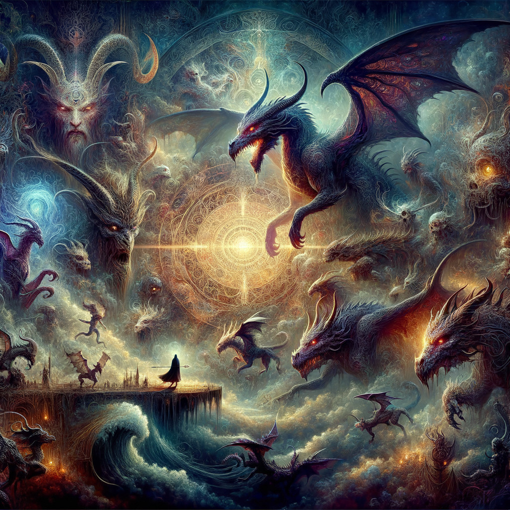 A fantastical scene featuring majestic dragons amidst a mystical gathering with robed figures, illuminated by glowing orbs in a grand, ancient city.
