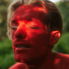 A vibrant portrait of a man with a stylized face, featuring bold colors like red, yellow, and blue. His expression is contemplative, set against a soft green background.
