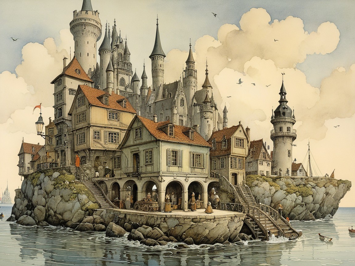 A fantastical island village with whimsical, multi-tiered buildings and spires, perched atop a large wooden ship. Surrounded by serene waters, it features boats and a rocky backdrop under a cloudy sky.