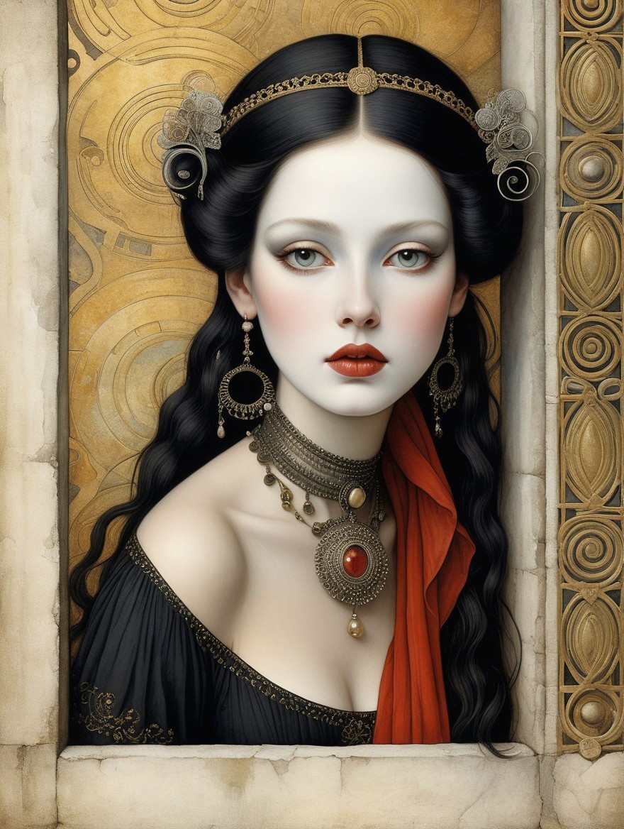 The image features a solemn, elegant woman with long black hair, wearing ornate attire and holding a white cat. She is surrounded by an intricate architectural backdrop, evoking a mystical atmosphere.