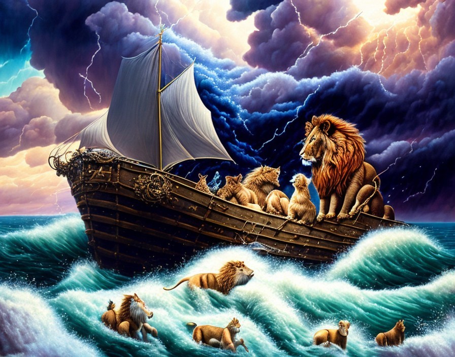 Surreal artwork depicting lions on a wooden ship amidst a stormy sea with some lions floating on waves and others in the sky.