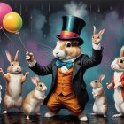 A charismatic rabbit in a top hat and tuxedo waves while holding colorful balloons. Surrounded by smaller rabbits in playful outfits, they create a whimsical, festive scene.