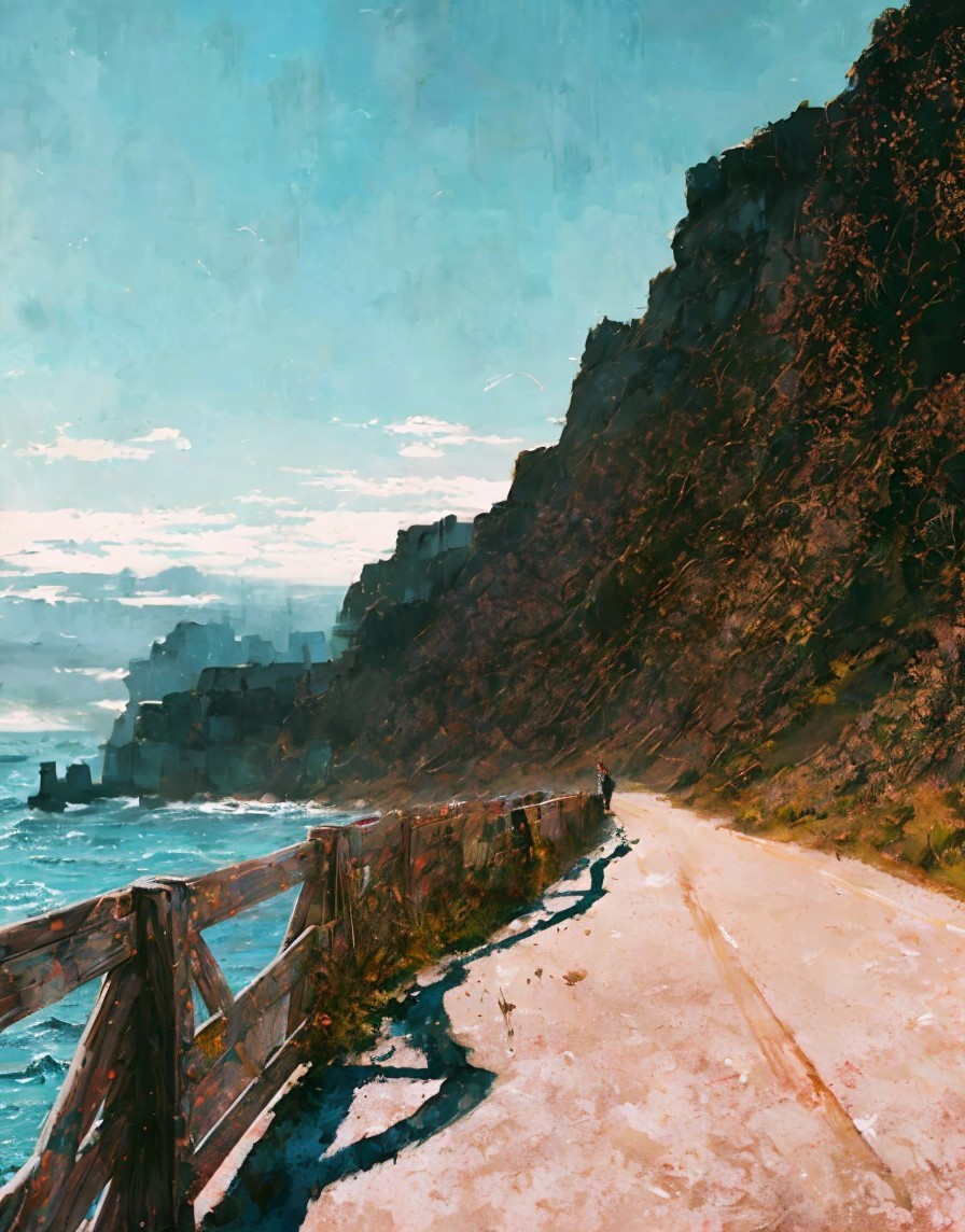 A winding coastal road hugs a rugged cliffside, with sunlight illuminating the rocky landscape. A lone figure walks along the path, surrounded by serene ocean views and dramatic cliffs.