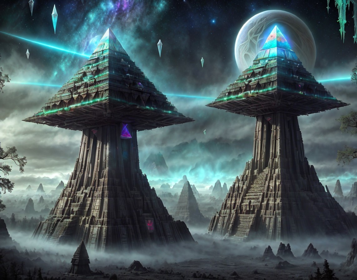 Prompt: In the style of Cameron Gray. Mystical temple pyramid with advanced technology on an extraterrestrial planet. Eerie and foggy forest landscape with tall oak and willow trees, large cliffs inscribed with petroglyphs. Pyramid surrounded by crystals, sacred geometry, mystical runes and alien glyphs. Surrealistic and supernatural elements under a cosmic sky. psychedelic sci-fi aesthetic, hallucinogenic art, visionary art, sci-fi LSD art