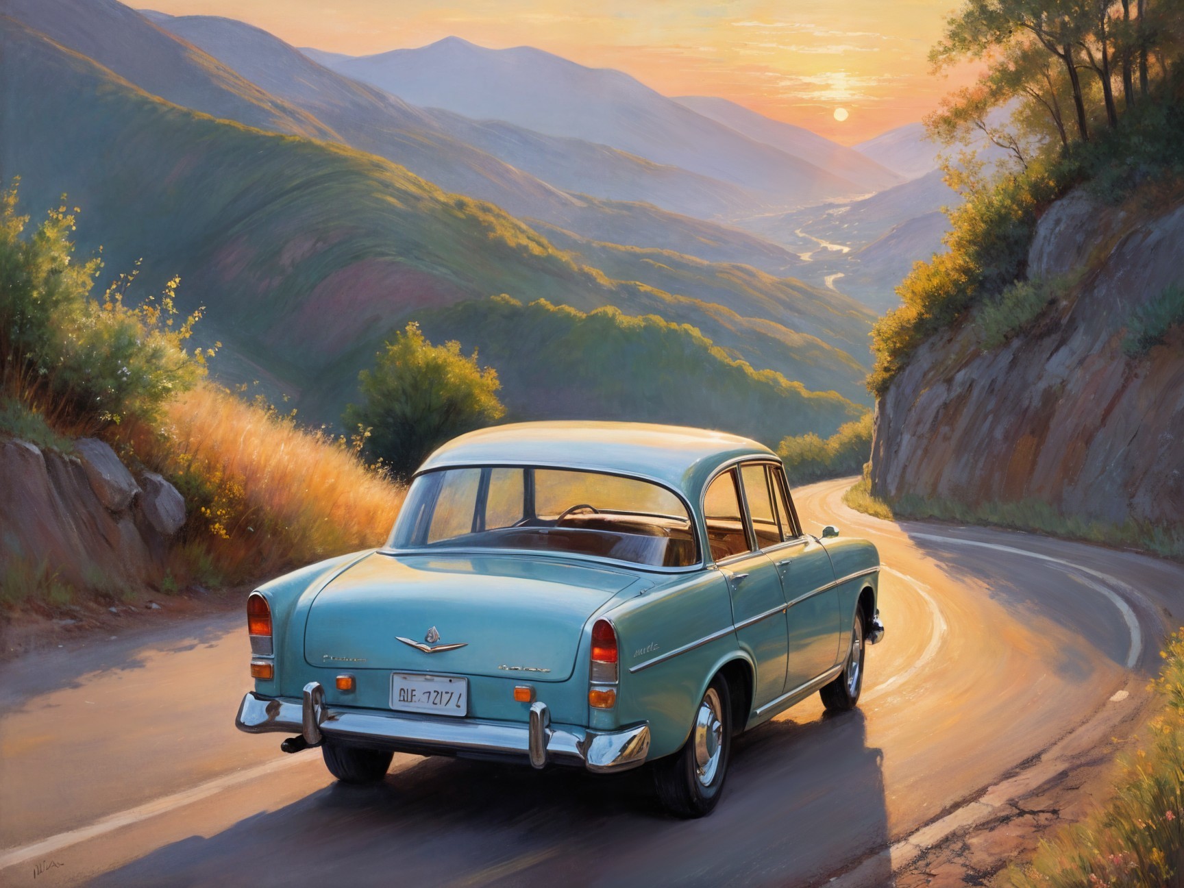 A vintage turquoise car is parked on a winding mountain road, bathed in the warm glow of a sunset. Lush green hills and a serene valley stretch into the distance, creating a picturesque scene.