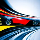 An abstract representation of a race car, featuring dynamic streaks of black, red, and yellow. The vibrant lines and colors evoke a sense of speed and motion against a light backdrop.