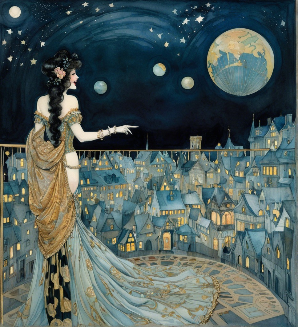 An elderly woman with a joyful expression sits at a billiards table, surrounded by colorful balls and playing cards. A vintage portrait hangs on the wall, enhancing the cozy, nostalgic atmosphere.