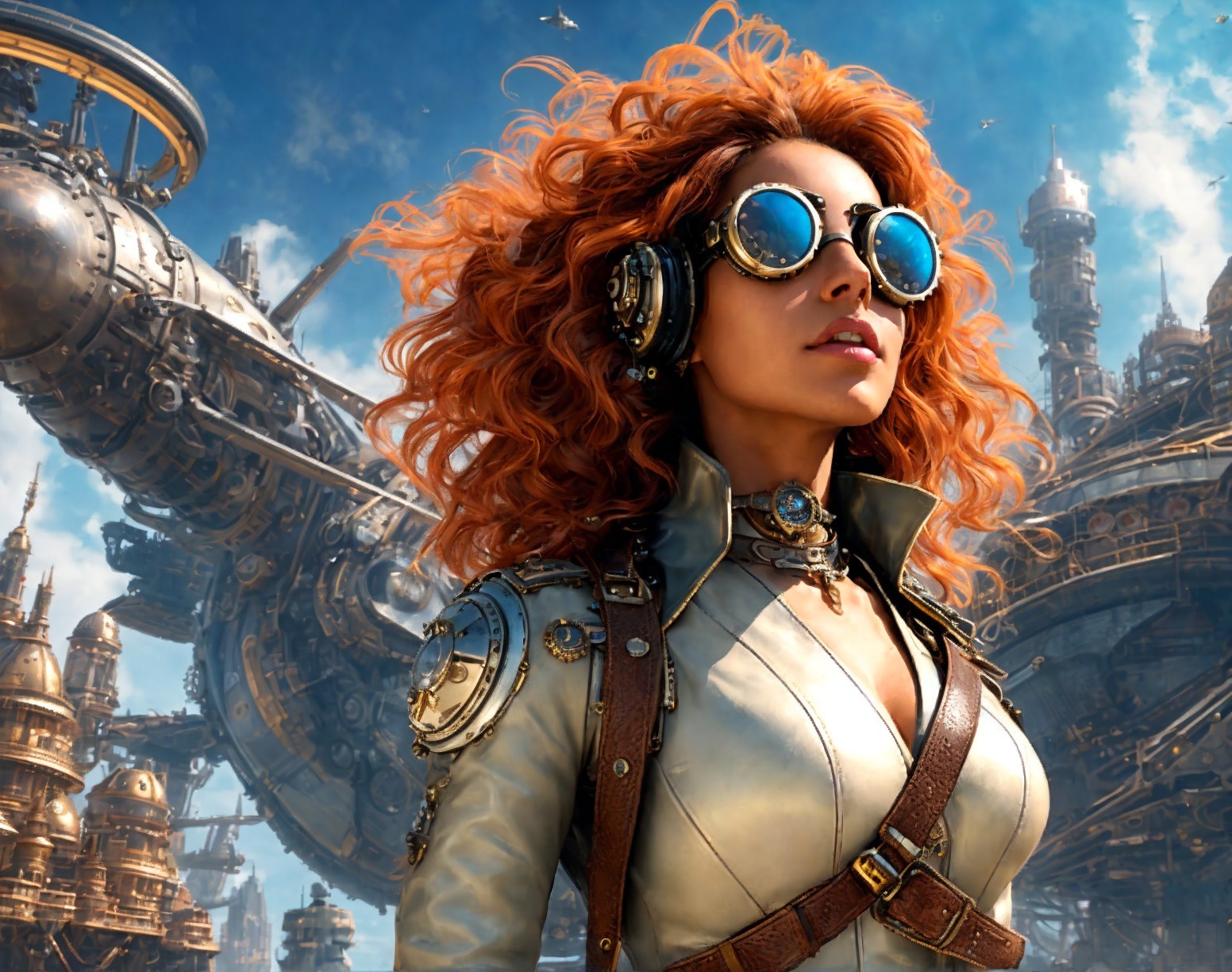 Steampunk futuristic portrait of a woman pilot clad in brass-edged goggles and leather attire, poised before a sprawling steampunk cityscape that boasts towering spires and revolving gears, an imposing spaceship casting a shadow over cobblestone streets, wide-angle view ensuring a balanced composition, dark hues with pops of triadic colors enhancing the scene's symmetry, hard surfaces gleaming with reflections, a distant planet looming in the backdrop, utilizing octane rendering for a hyper-detailed, cinematic epic