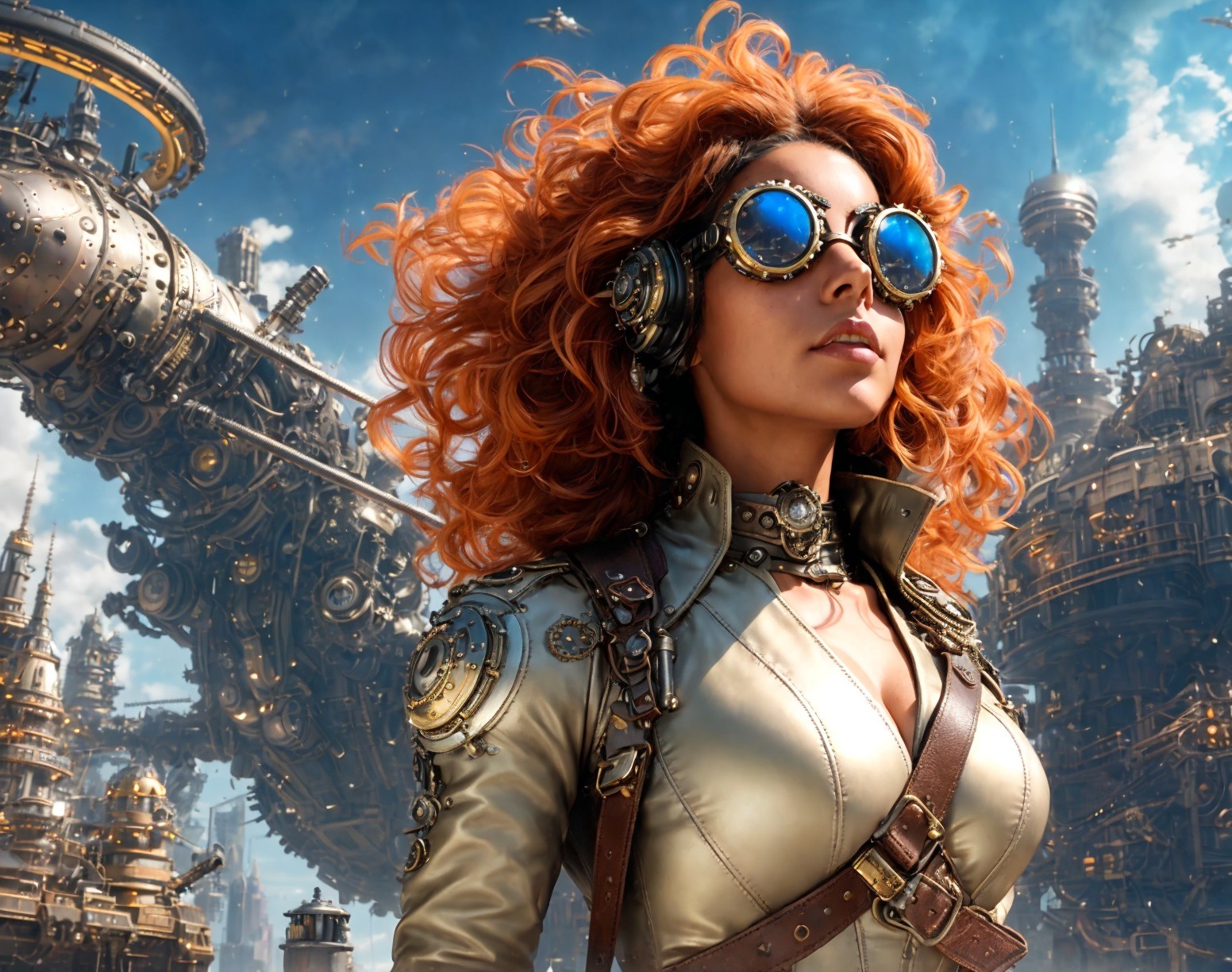 Prompt: Steampunk futuristic portrait of a woman pilot clad in brass-edged goggles and leather attire, poised before a sprawling steampunk cityscape that boasts towering spires and revolving gears, an imposing spaceship casting a shadow over cobblestone streets, wide-angle view ensuring a balanced composition, dark hues with pops of triadic colors enhancing the scene's symmetry, hard surfaces gleaming with reflections, a distant planet looming in the backdrop, utilizing octane rendering for a hyper-detailed, cinematic epic