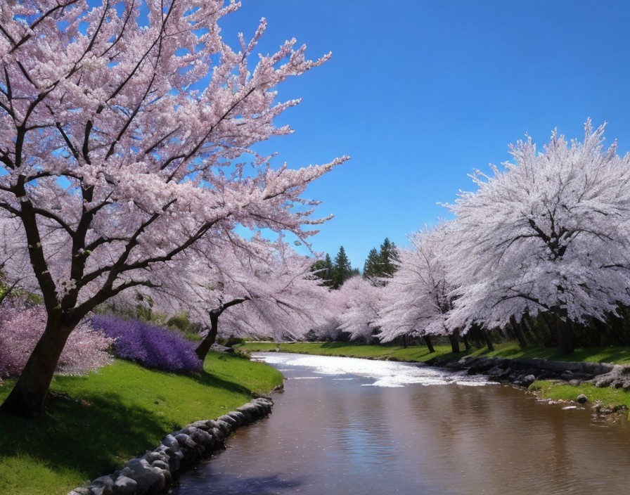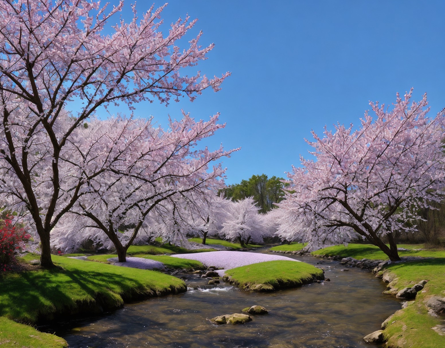 Pink Cherry Trees Over Rocky Creek Under Blue Skies