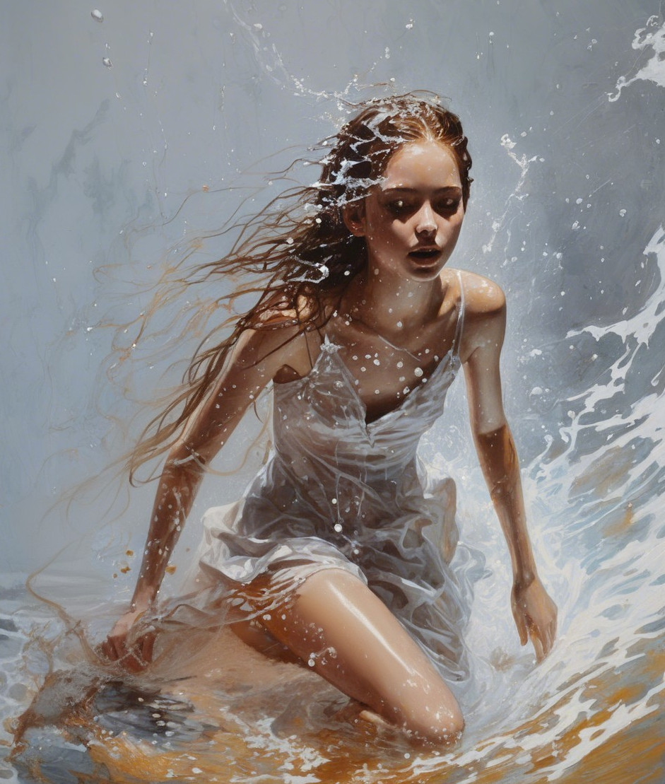 Prompt: girl made of water, splashing, waves, sea spray, impasto oil painting, dark, abstract, ominous, style of Dave McKean, Christopher Bucklow, Stephen Gammell and Jeremy Mann
