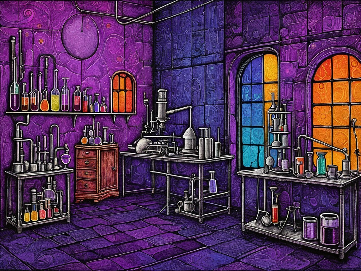 A vibrant digital illustration in a psychedelic, cel-shaded style depicts an ornate wizard's laboratory with purple walls and floors, adorned with intricate, swirling patterns. Several glass bottles and beakers filled with colorful liquids sit on shelves and tables throughout the room. Two arched windows with stained-glass panes cast