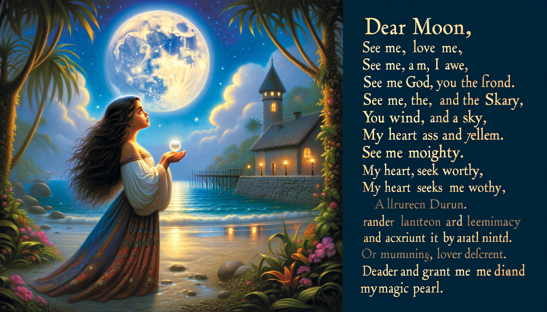 Prompt: "A young beautiful girl standing on the sore, looking at the moon. She said-“Dear Moon, see me,love me, see me as I am, you and God and wind and sky, see me,