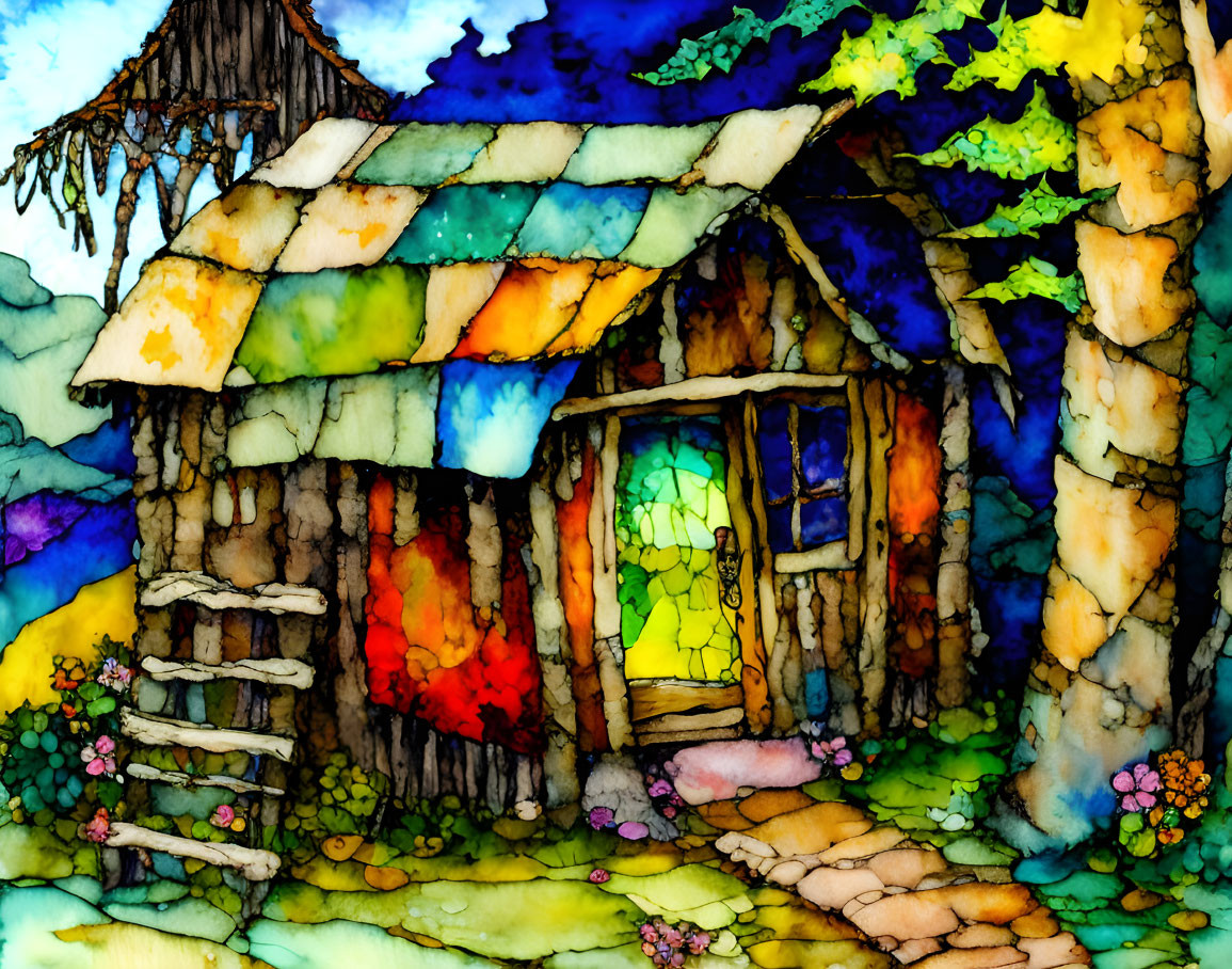 Prompt: "Watercolor patchwork painting of Rumplestiltskin in a primitive hut, greens, browns and yellow and orange, no signature no watermark, Patchwork by Meghan Duncanson and Jennifer Lommers and Didier Lourenço"