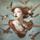 A woman with flowing red hair is surrounded by a flurry of birds in a dreamlike setting. She gazes upward, evoking a sense of freedom and connection with nature. The scene blends beauty and whimsy.