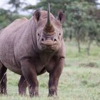 Hot neon 1980s punker mohawk with stripes shaved, mutated half man half rhino deformed foot clan street thug, face piercings 1980s slit sunglasses, ears piercings, over powered muscled menace, adversarial animalistic angered bully