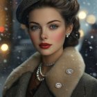 A glamorous woman with striking features gazes intently, adorned in a vintage coat with a fur collar. She wears a chic hat and elegant pearl jewelry, set against a softly lit, festive backdrop.