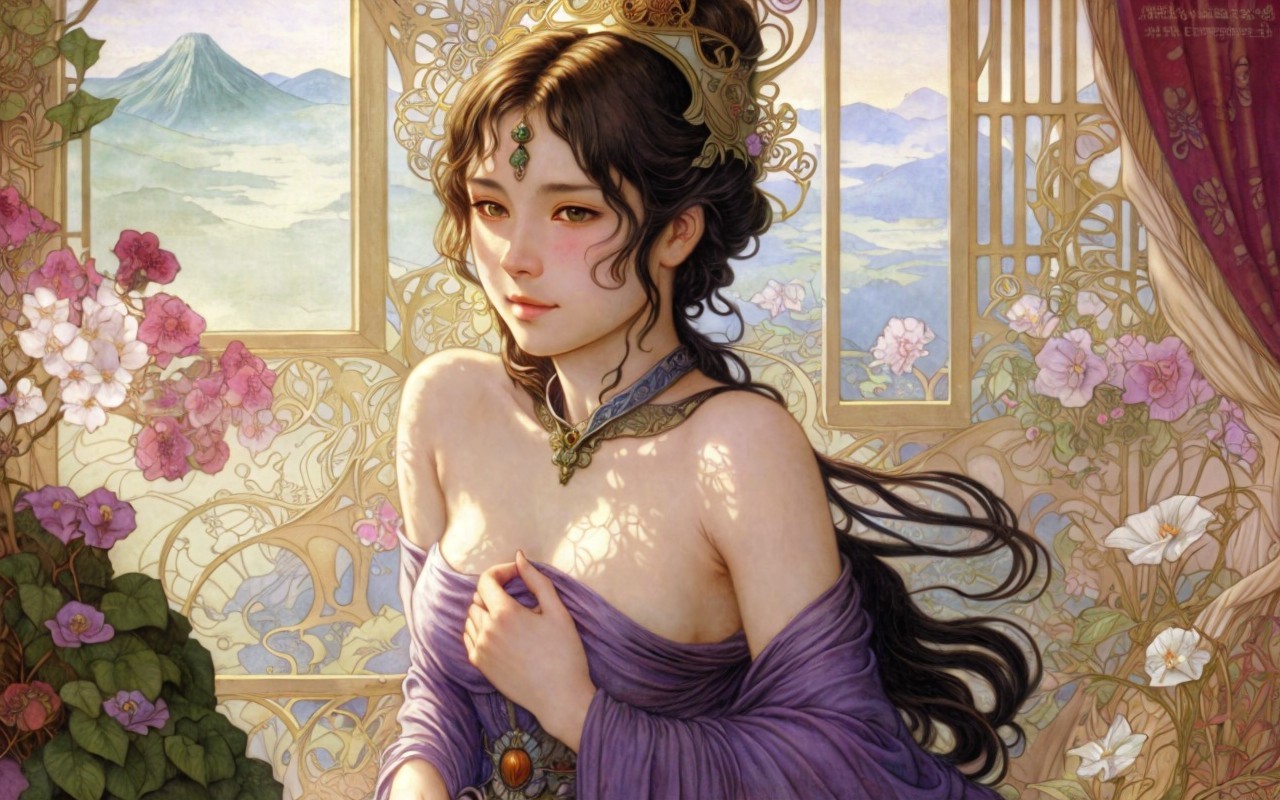 Illustrated woman with dark hair by window overlooking castle, surrounded by roses and book